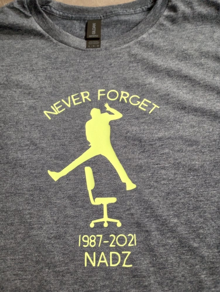 Epic chair jump design on a greyish soft style tee. I have some other colors if you'd like to try for another. Make a note on order page or use the contact page.